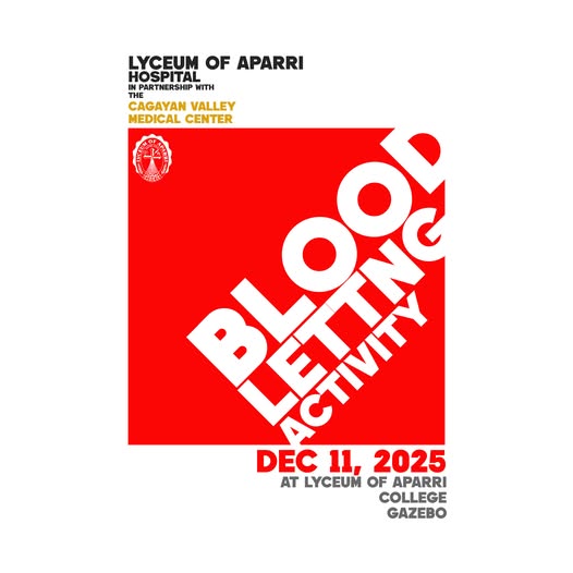 One Drop Given, A Life Renewed. The Lyceum of Aparri Hospital and Lyceum of Aparri College of Nursing invites everyone to take part in a Blood Letting Activity on December 11, 2025, starting 8:00 AM onwards, at the Lyceum of Aparri College Gazebo. This life-saving initiative is in partnership with the Cagayan Valley Medical Center. Every unit of blood collected will be used to support patients who require emergency treatment, surgeries, and life-saving care. A single donation can help save multiple lives; C'mon! Make Your Mark by Saving Lives!